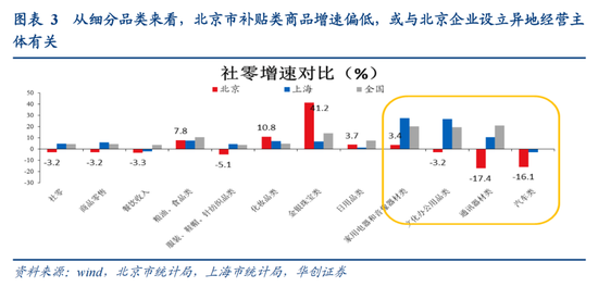 在“企业注册地”的统计方式下,由于北京企业密集设立异地经营主体,此前计入北京的社零转移至京外,部分导致了北京社零读数偏弱。据北京统计局解释“北京总部型经济特征明显”,“由于企业经营模式发生变化,跨区域设立经营主体明显增加,部分单位在京实现的零售额受到一定影响”。