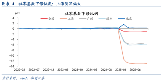 一是,参照官方表态,据上海市统计局“按照国家统计局加快推进经营主体活动发生地统计工作总体要求,上海社会消费品零售总额数据基数已根据全国第五次经济普查结果进行了修订。2025年起,全市社会消费品零售总额相关指标月度增速按照可比口径计算”,所谓“经营主体活动发生地”,即经济活动从企业注册地统计,转向经营活动实际发生地统计。今年政府工作报告中也提及,“逐步推广经营主体活动发生地统计”。