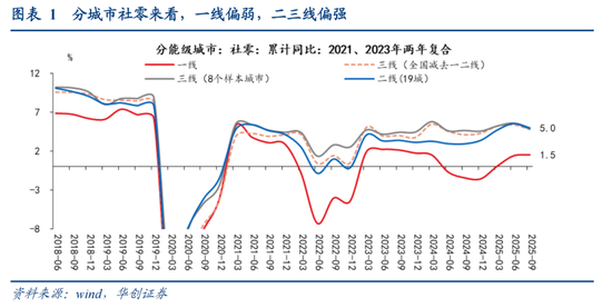 2024年,我们曾分析为何一线社零偏弱、三四线社零偏强,参见报告《一线城市消费为何走弱?》、《三四线城市消费为何偏强?》,目前来看,这一趋势仍在延续,今年前三季度,全国社零同比增长4.5%,一线增速为1.5%,而二线(19城)、三线(轧差得来)增速均在5%左右,2024年为-1.6%、3.4%、4.3%。