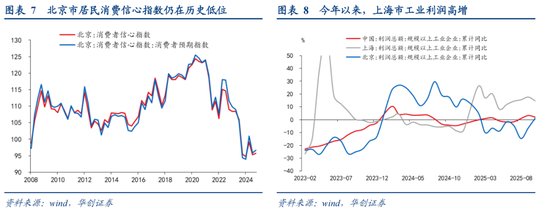二是从企业端看,我们以企业的“管理费用+销售费用”衡量企业的消费。今年前三季度,上海市上市公司管理费用+销售费用同比-1.4%,较2024年的-7.2%,拖累明显收窄。北京则变化不大,绝对增速仍在-1%附近,结合北京规上工业企业数据,今年前10月销售费用、管理费用分别同比-3%、0.7%,企业消费或仍旧偏弱。从原因看,北上企业消费分化或与利润端有关,北京市工业企业利润同比增长1.5%,与全国的1.9%大体持平,而上海工业利润增速达到14.5%。