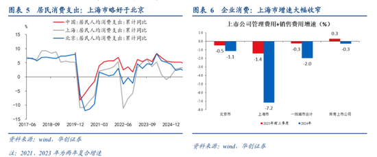 二是从企业端看,我们以企业的“管理费用+销售费用”衡量企业的消费。今年前三季度,上海市上市公司管理费用+销售费用同比-1.4%,较2024年的-7.2%,拖累明显收窄。北京则变化不大,绝对增速仍在-1%附近,结合北京规上工业企业数据,今年前10月销售费用、管理费用分别同比-3%、0.7%,企业消费或仍旧偏弱。